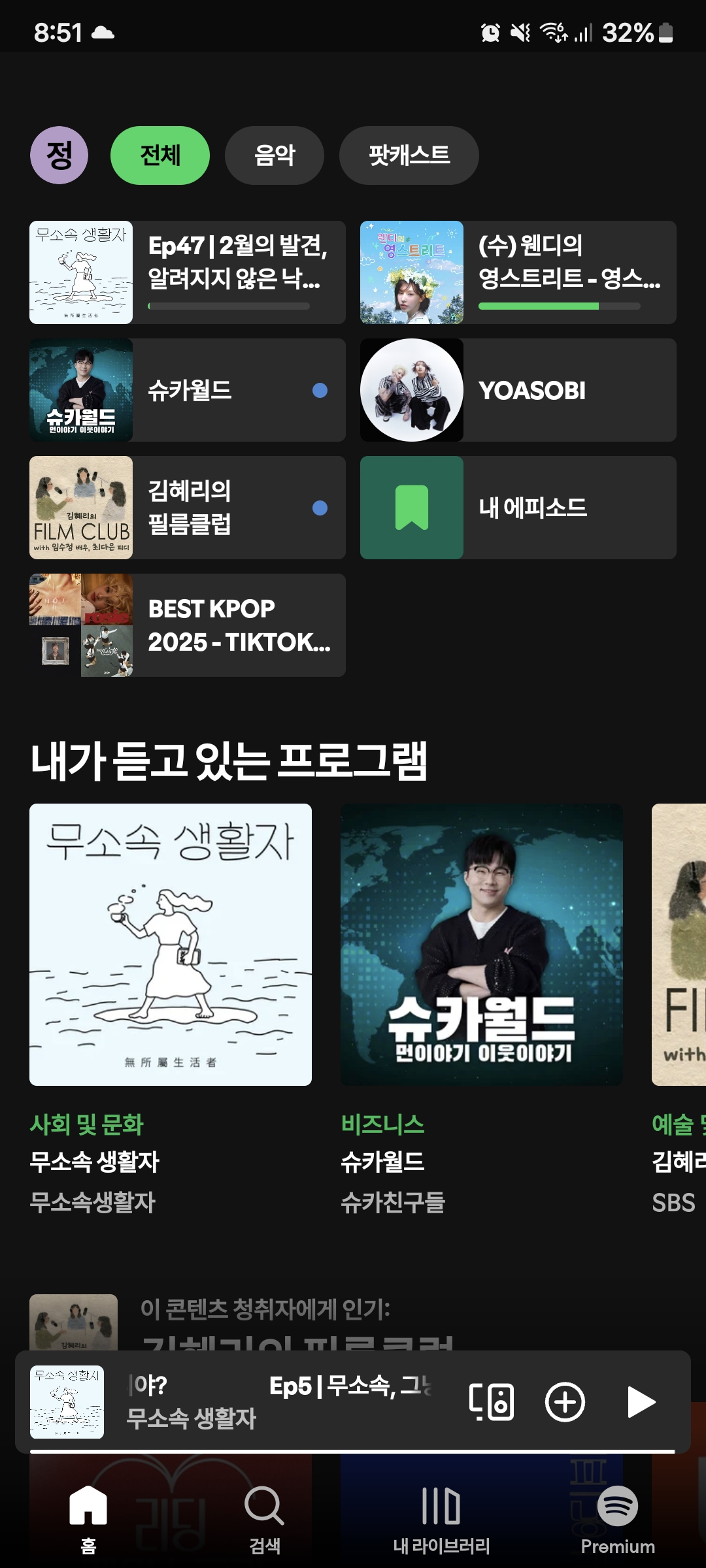 팟캐스트를 듣게 되며 하나 꼭 추천하고 싶은 채널은 '무소속 생활자' 채널이다. 무심코 인기 채널을 둘러보며 어떤 방송을 들을까 찾아보다가 일러스트와 제목에 끌려 한 두 편 들어봤는데 두 진행자의 목소리가 잔잔하니 좋고, 내용도 공감이 되어서 편안하게 듣기 가장 좋았다.